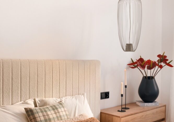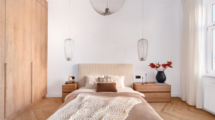 – na wyposażeniu boucle’owe łóżko oraz pojemne stoliki nocne wykonane na zamówienie,