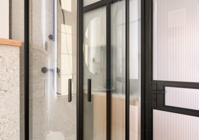 – do łazienki prowadzą drzwi osadzone na metalowo-szklanej ścianie wykonanej według naszego indywidualnego projektu na zamówienie. Szkło matowe, dwuwarstwowe, ryflowane,