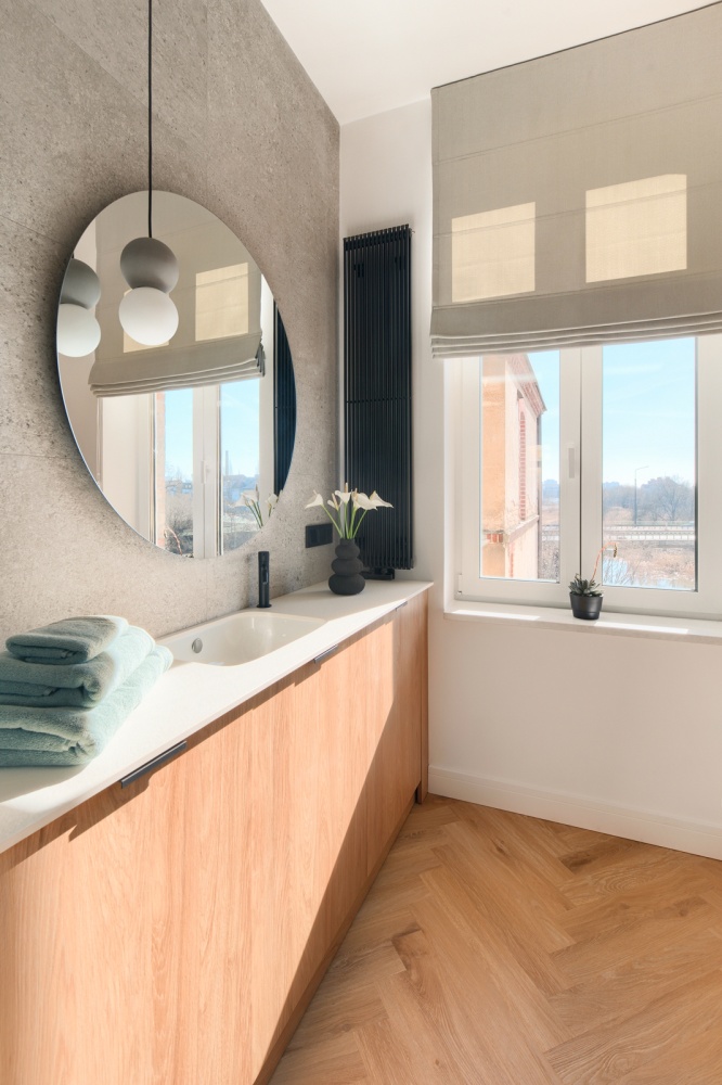 – wyposażona w prysznic, umywalkę, WC, podświetlane lustro, pralkę, wysuwany kosz na bieliznę oraz roletę wewnętrzną,