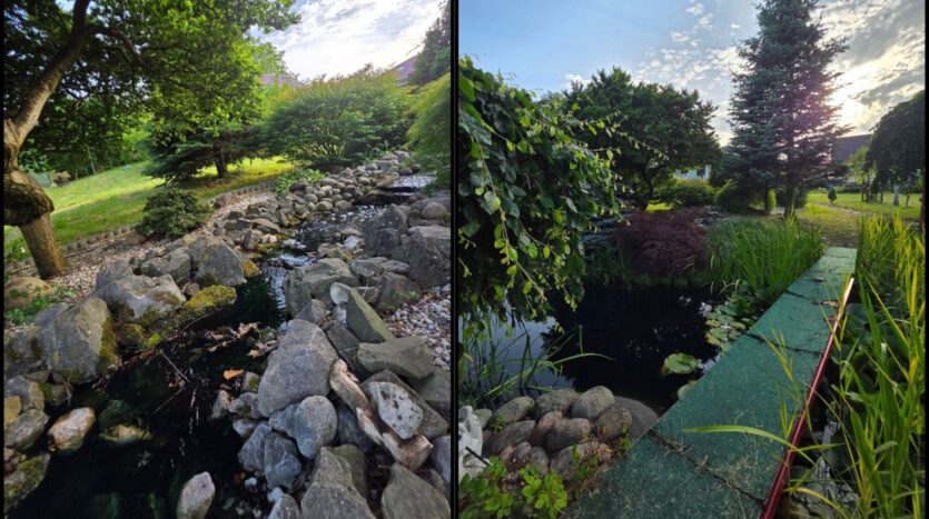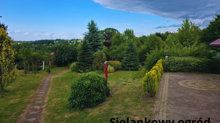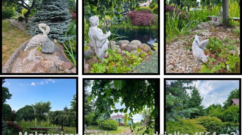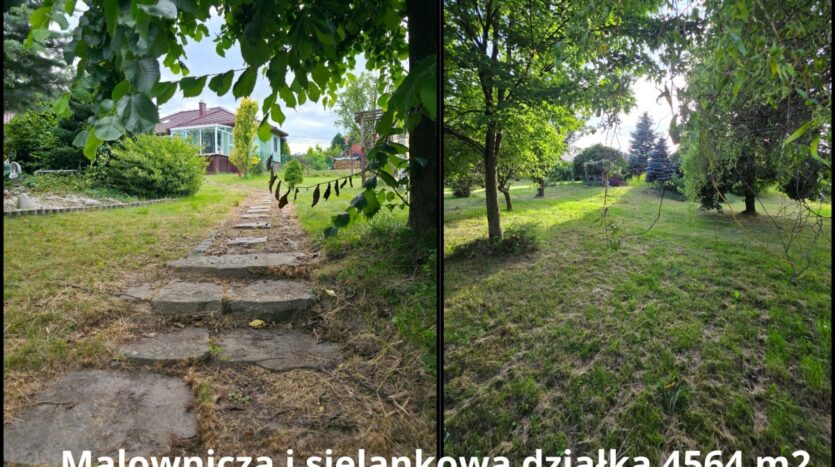 Zadbana działka 4564 m², z licznymi nasadzeniami: drzewa liściaste, iglaste i owocowe, krzewy ozdobne, trawniki.