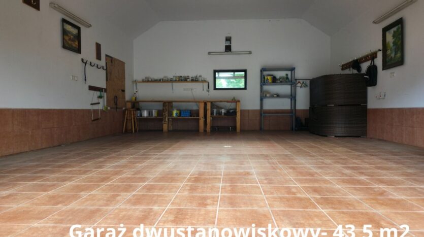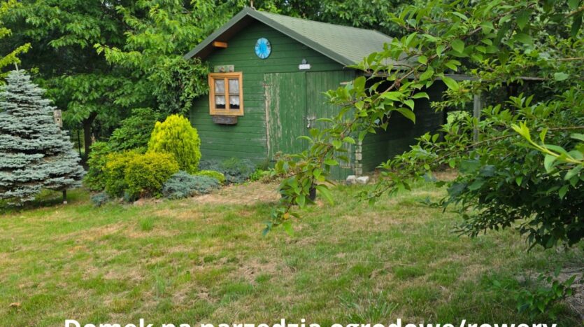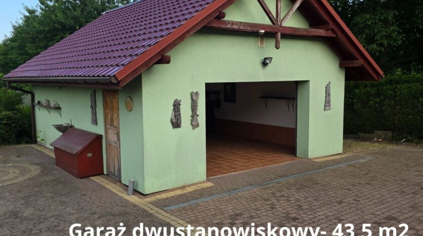 Murowany garaż dwustanowiskowy (43,5 m²) oraz drewniany domek na narzędzia ogrodowe.