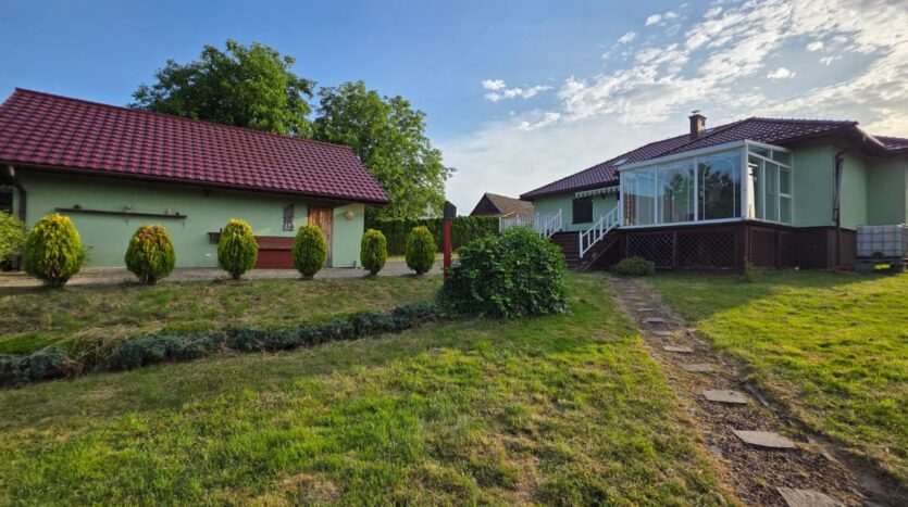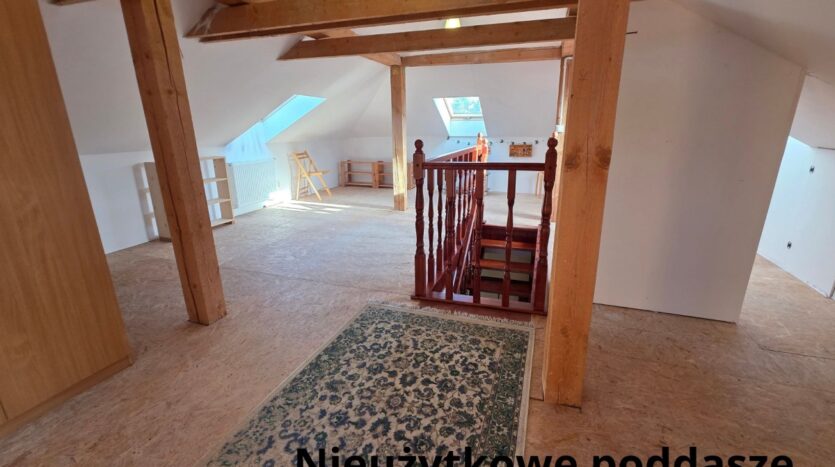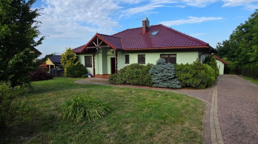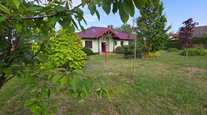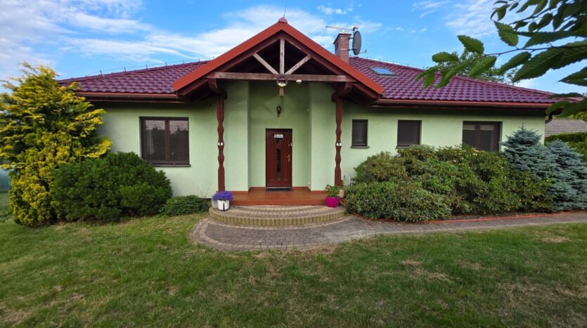 Dom parterowy z poddaszem (obecnie nieużytkowym) o powierzchni 129 m², z przestronnym salonem, trzema sypialniami i ogrodem zimowym (13 m²).