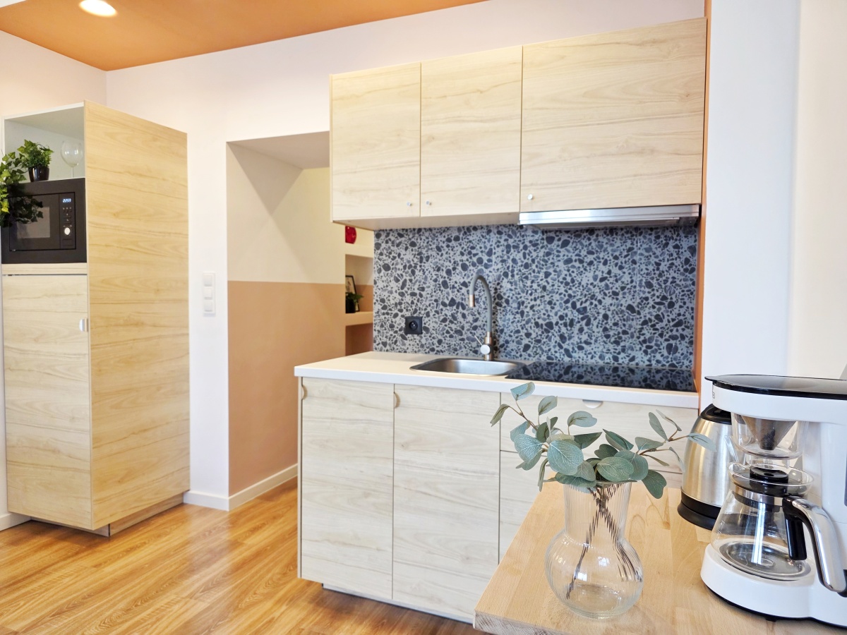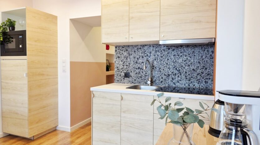 – aneksu kuchennego (płyta indukcyjna, okap, zlew, lodówka z zamrażarką, kuchenka mikrofalowa, szafki kuchenne – wszystko nowe),