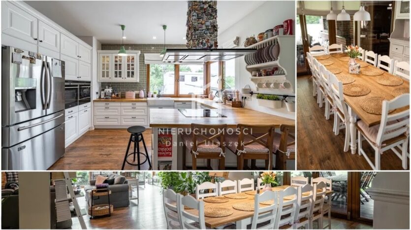 Kuchnia w stylu prowansalskim z imponującą wyspą została zaprojektowana jako harmonijne połączenie estetyki i funkcjonalności. Tuż obok znajduje się jadalnia przygotowana na wystawne kolacje i spotkania w większym gronie.