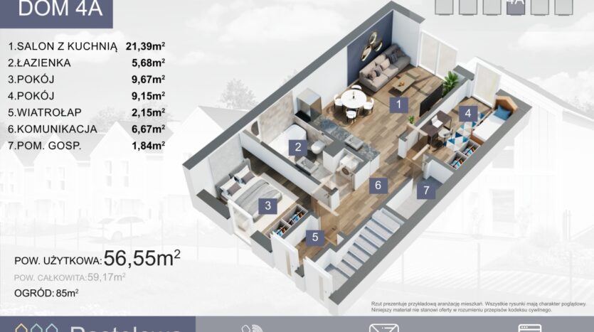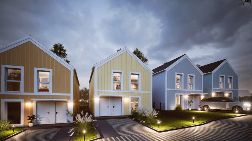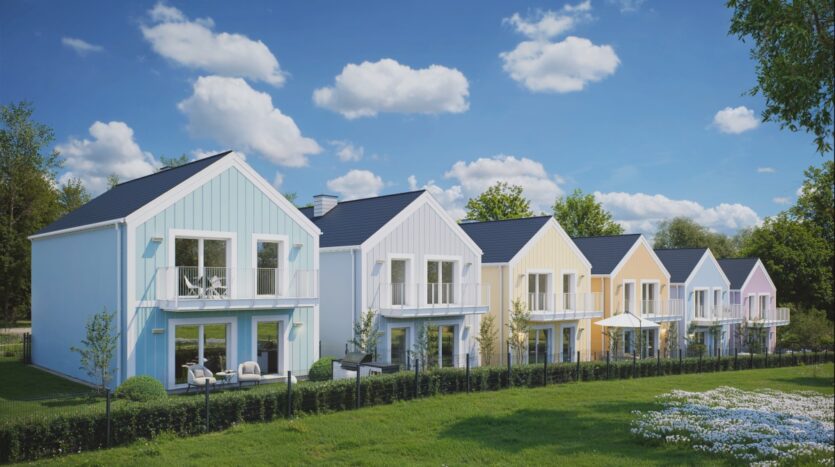 Pastelowa Osada to kameralne osiedle 6 domów dwurodzinnych podzielonych na mieszkania na górze (z balkonem) oraz na dole (z ogrodem).