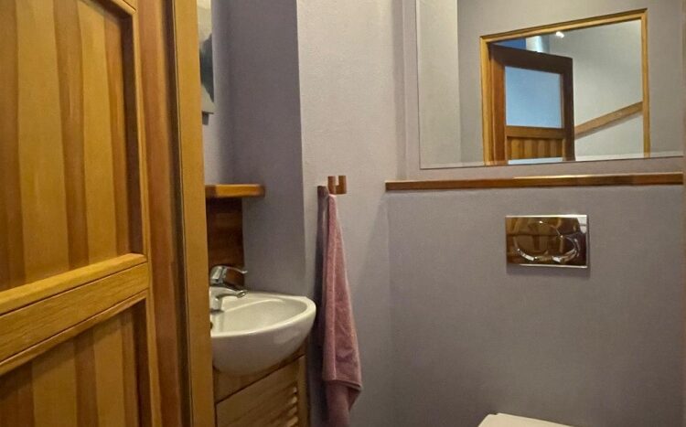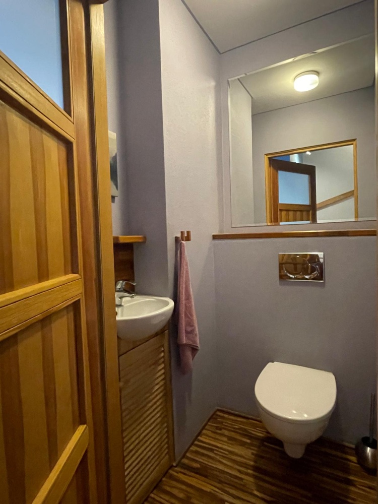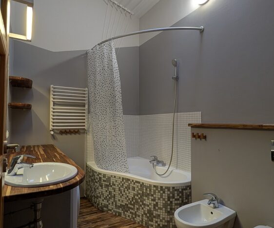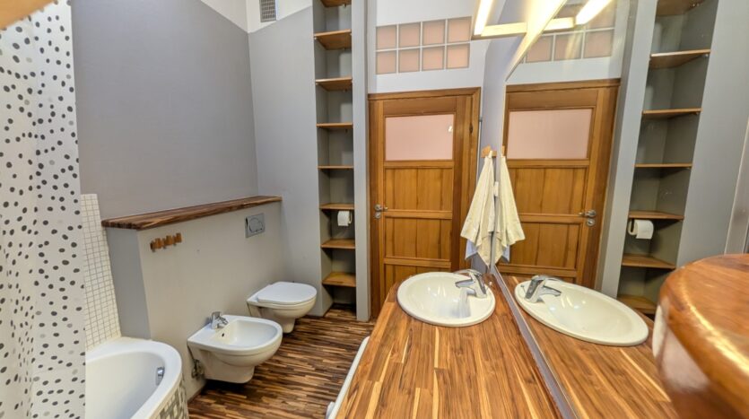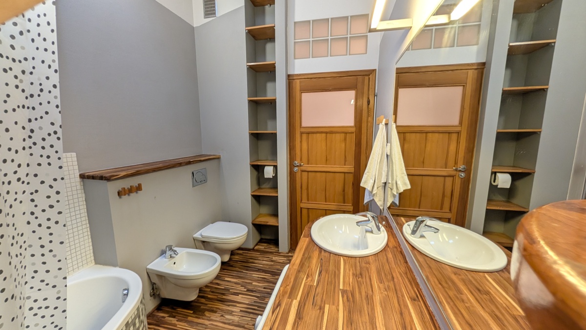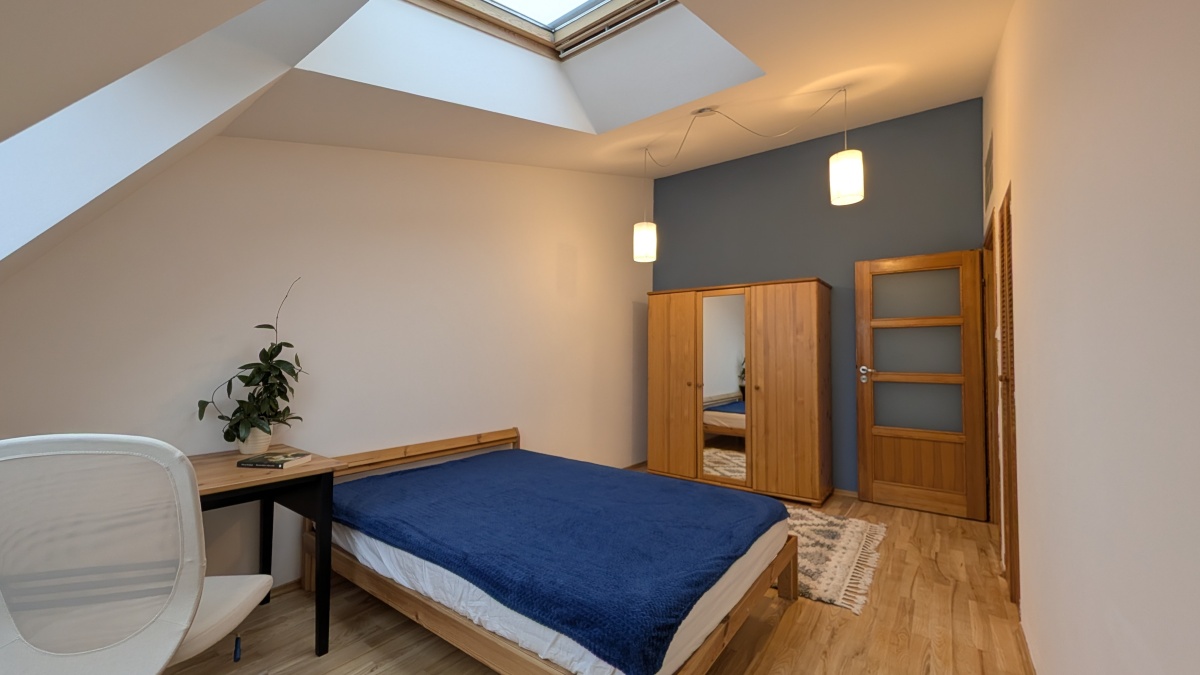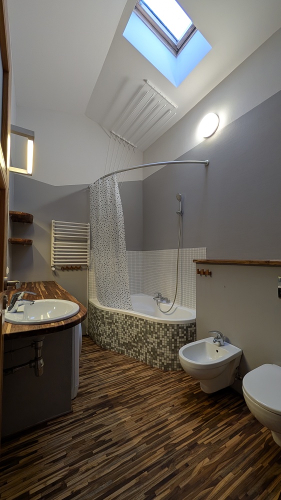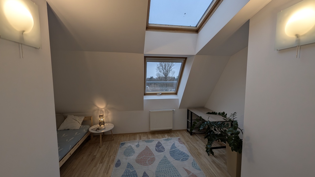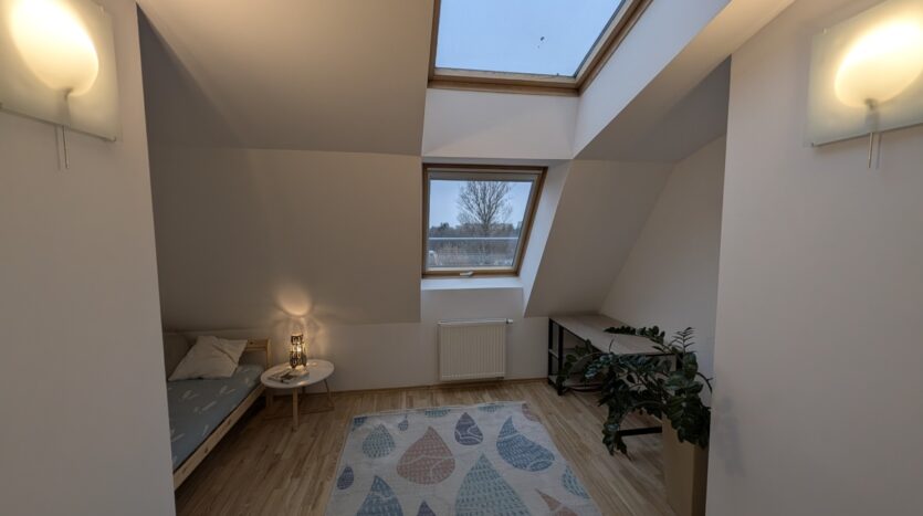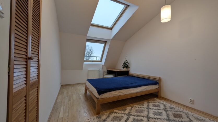 Wnętrza na górze są „z oddechem”, sufit sięga wysokości 3,3 m, klimatyczne skosy z dużymi oknami dachowymi. To dwie ustawne sypialnie i duża łazienka z wanną, wc, bidetem.