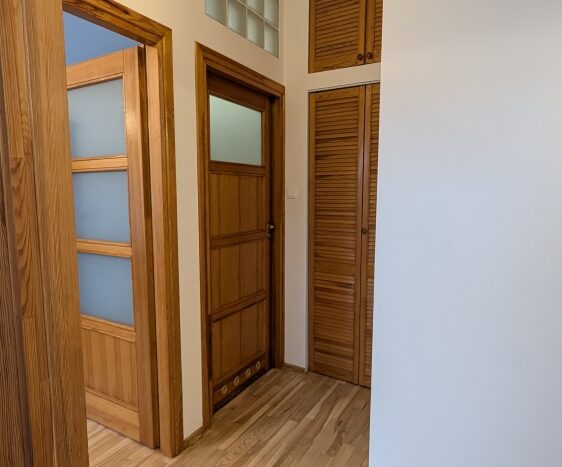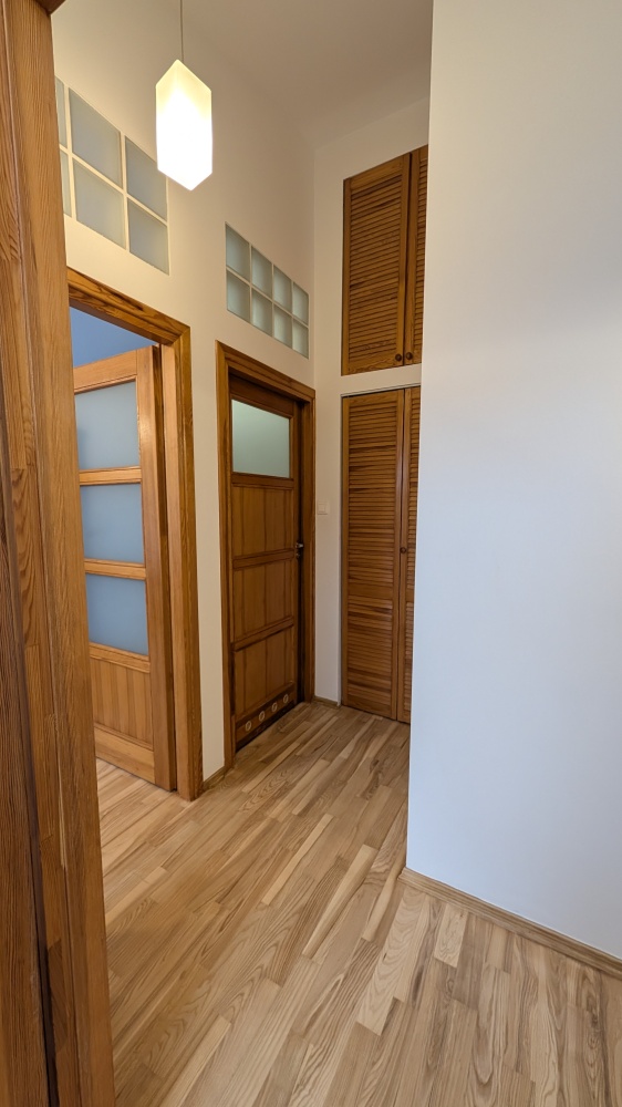 W górnym przedpokoju i sypialni są szafy w zabudowie, a w drugiej sypialni – przepastny schowek.