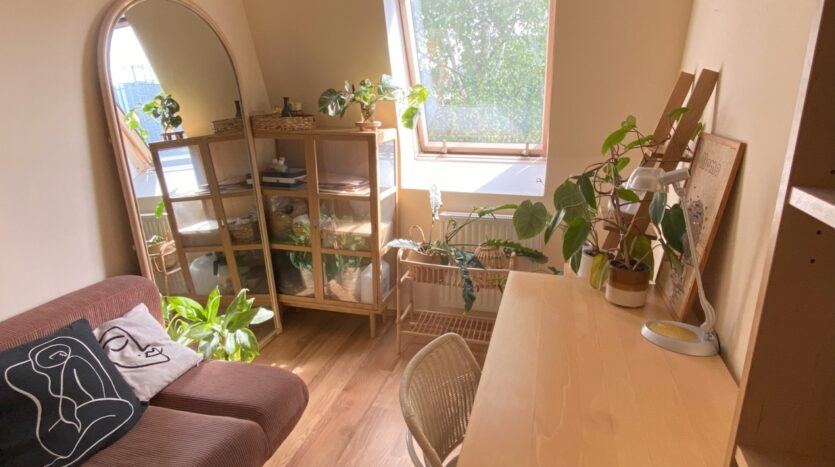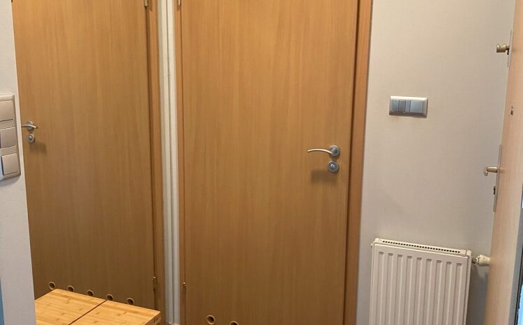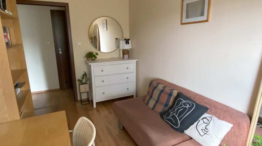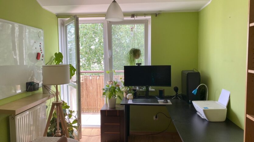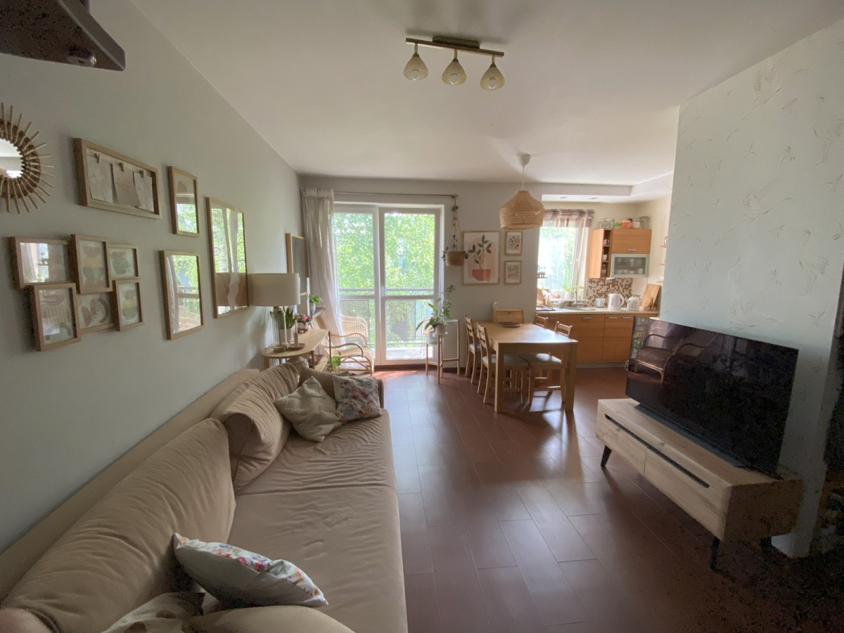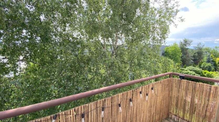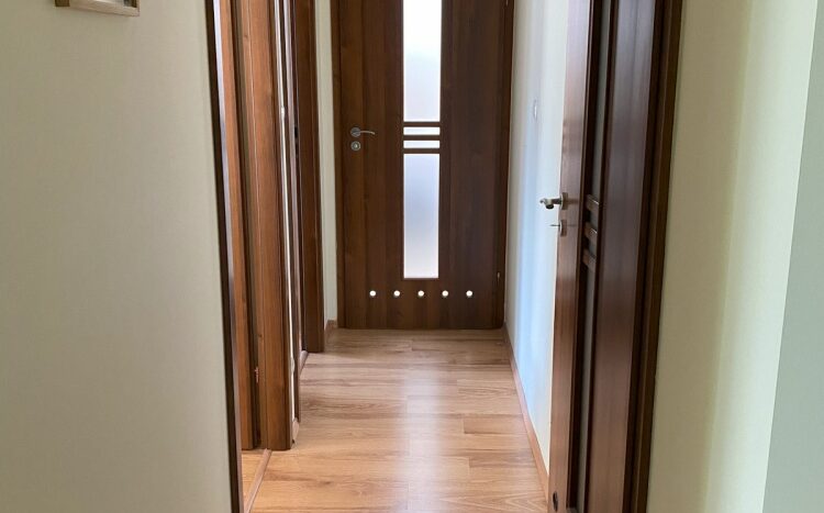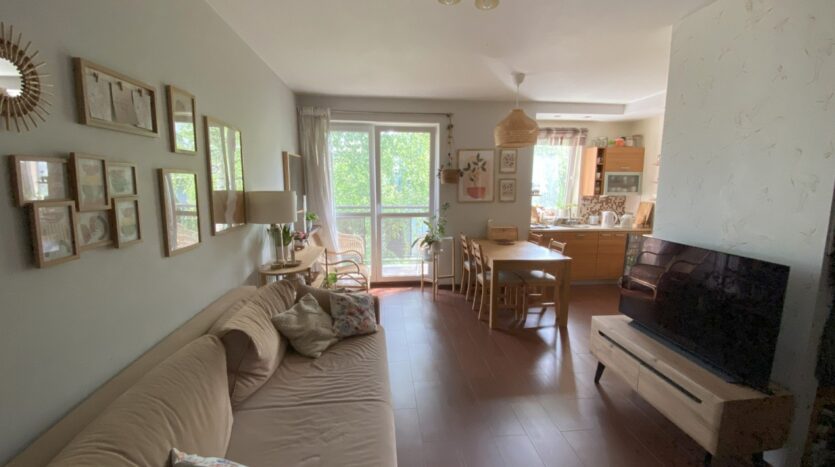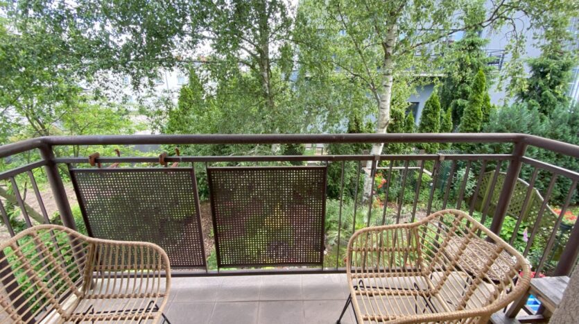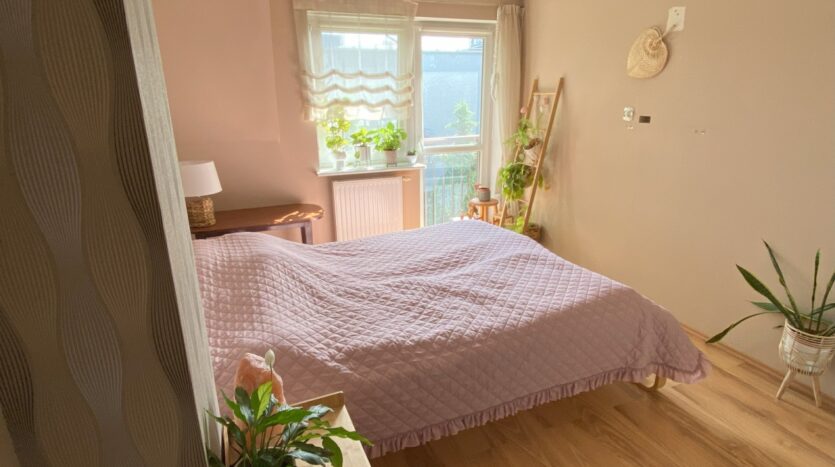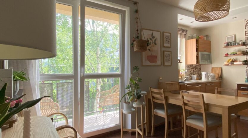 W skład mieszkania wchodzą trzy ustawne pokoje, salon z aneksem kuchennym, dwie łazienki, pomieszczenie gospodarcze oraz dwa balkony z pięknym widokiem na ogród i drzewa. Mieszkanie jest w pełni umeblowane i gotowe do zamieszkania – wyposażone w zmywarkę, lodówkę, kuchenkę, piekarnik i pralkę. Lokal oferuje bardzo dużo miejsca do przechowywania – w każdym pomieszczeniu znajdują się pojemne szafy, regały lub komody. Mieszkanie jest doskonałą alternatywą dla domu w zabudowie szeregowej.