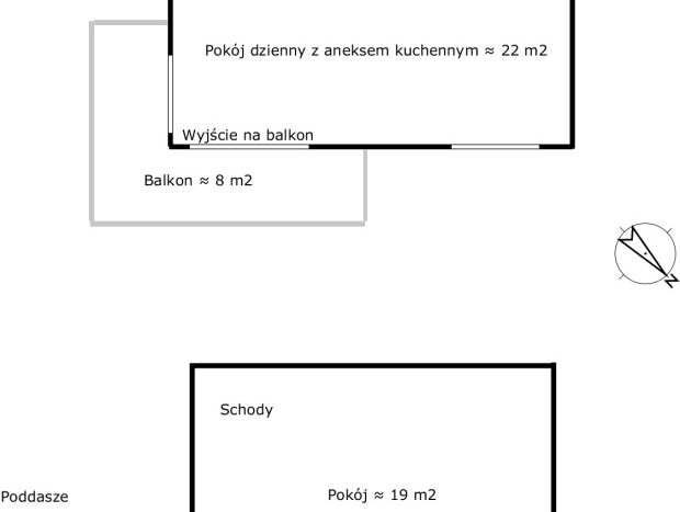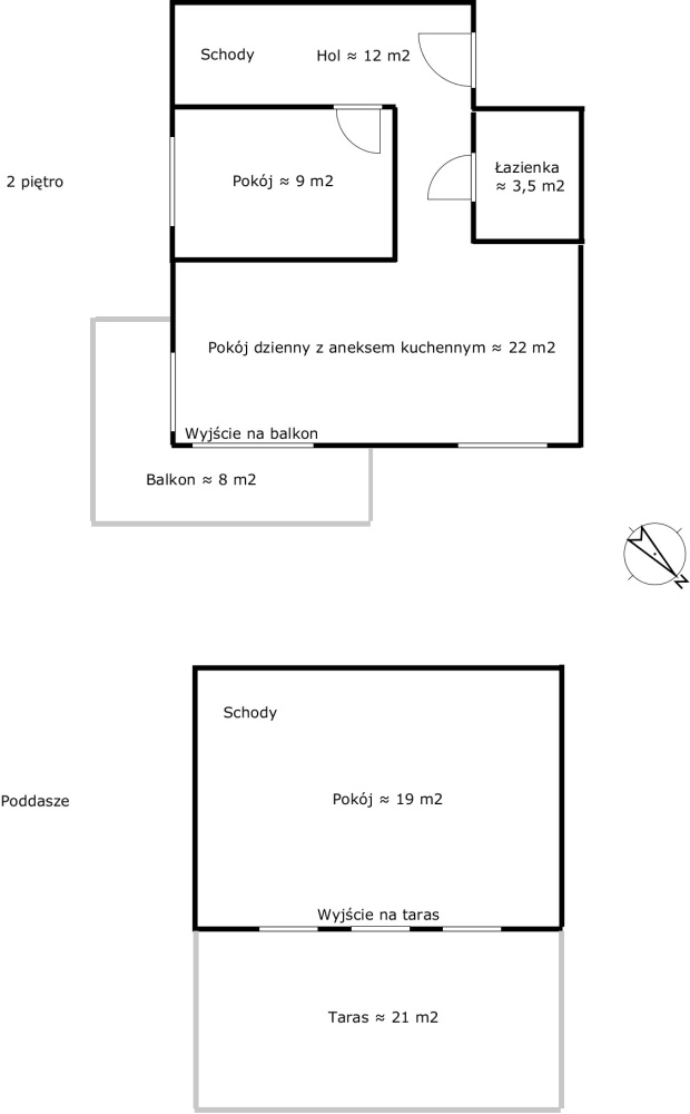 poziom główny: pokój dzienny z aneksem kuchennym, pokój, łazienka, hol ze schodami na poddasze
