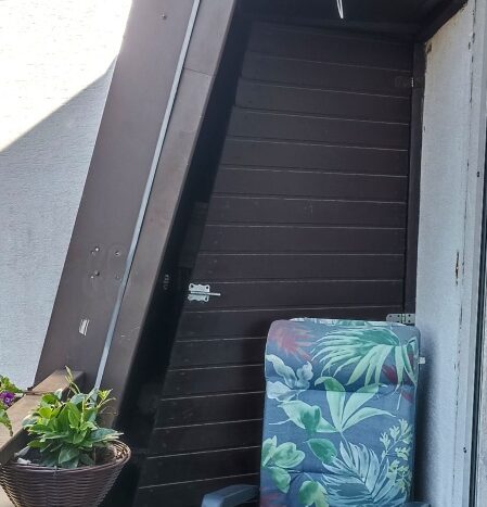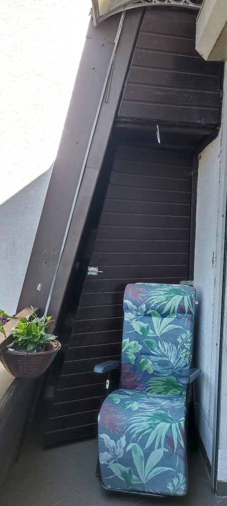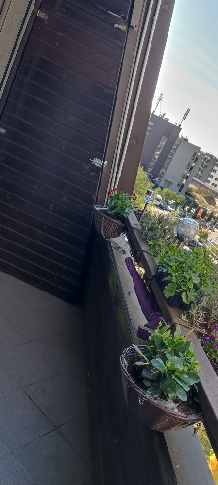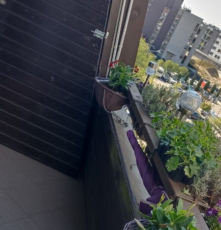 Balkon z widok na teren zielony osiedla (nie ma ryzyka budowy naprzeciwko okien), ze schowkami i z półkami po obu stronach (łącznie ok. 7 m2),