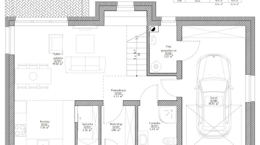 Garaż w bryle budynku: 19,97 m² – idealne miejsce na samochód i dodatkowe przechowywanie.