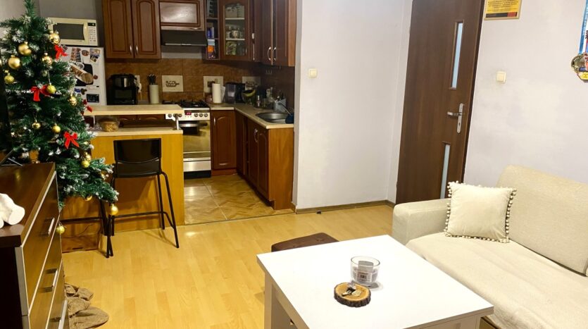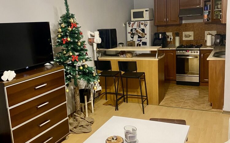 1) Pokój a aneksem kuchennym o łącznej powierzchni 20,90m2 – w cenie meble kuchenne ze sprzętem AGD ( kuchenka gazowo-elektryczna, okap, lodówka) komoda, szafa, kanapa.