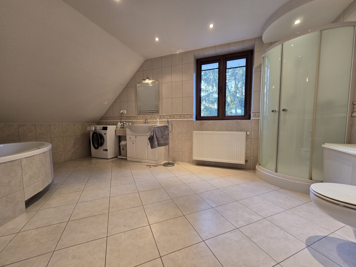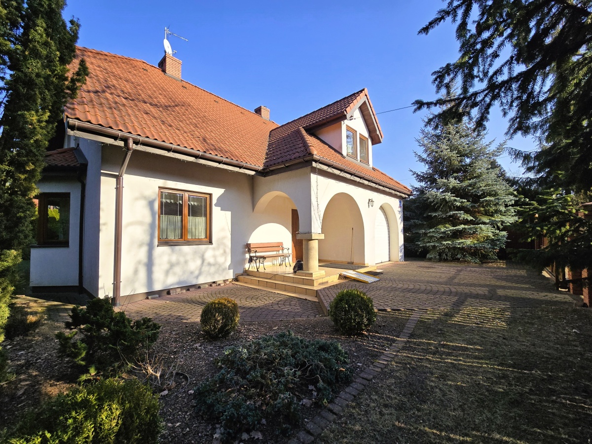 Dom był budowany dla siebie i z pewnością technicznie przewyższa obecne „standardy” stosowane przez deweloperów lub osoby budujące pod kątem sprzedaży. Budynek został wykonany w 2003 roku w technologii tradycyjnej z cegły typu POROTHERM o grubości 30 cm, ocieplony styropianem 10 cm i zabezpieczony tynkiem cementowo-wapiennym. Na dachu została położona dachówka ceramiczna firmy BRAAS. Bez zarzutu działający piec grzewczy firmy De Dietrich oraz system alarmowy to kolejne plusy, o których warto napisać.