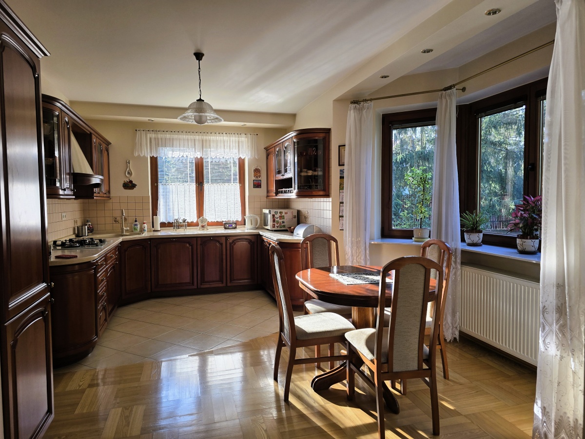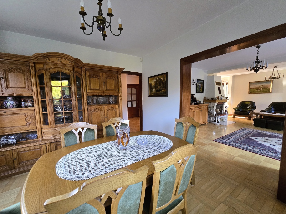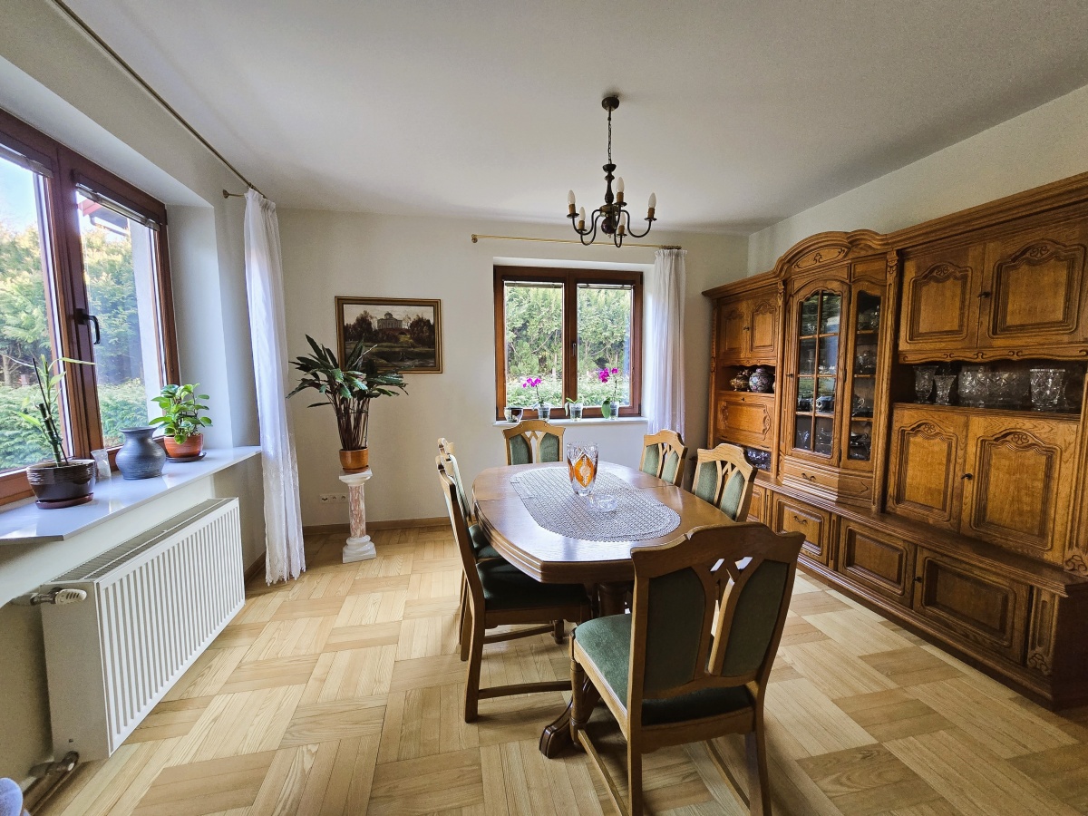 Dom utrzymany jest w świetnej kondycji. Podłogi dębowe zachowane są niemalże w idealnym stanie, kuchnia w drewnianej zabudowie z włoskiej akacji wciąż ma swój urok, drewniane okna działają bez zarzutu. Oferta obejmuje również kompletne umeblowanie i wyposażenie (w tym również dodatkowa duża zamrażalka, kosiarka, wyposażony przydomowy warsztat w garażu, telewizor).