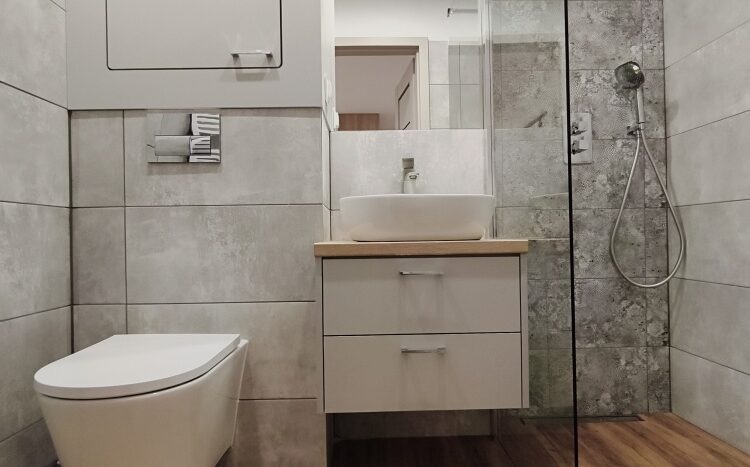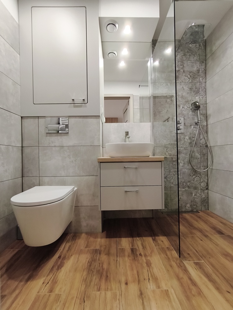 Nowoczesna łazienka z prysznicem wyposażona jest w nowy piec Junkers dwufunkcyjny z płaszczem wodnym, zapewniający komfort i oszczędność.