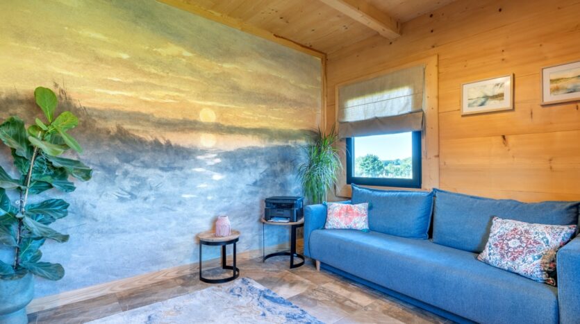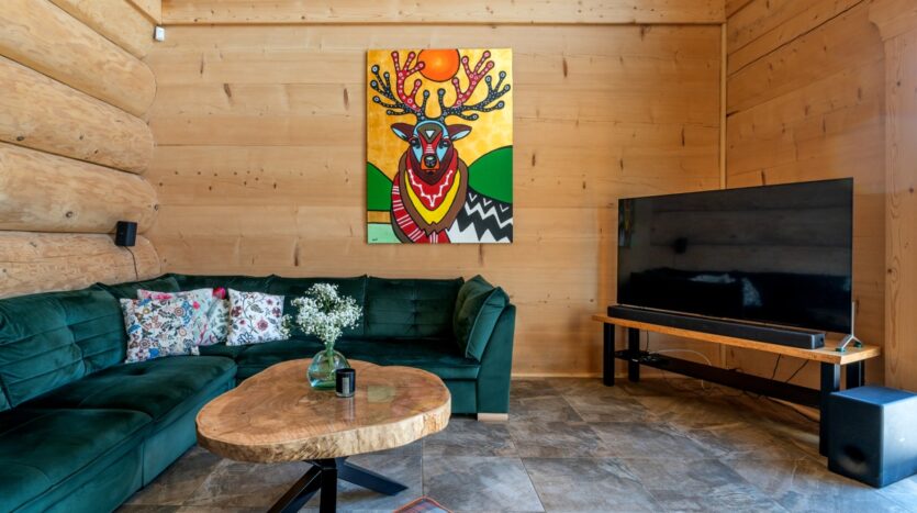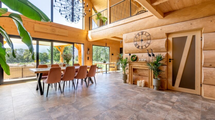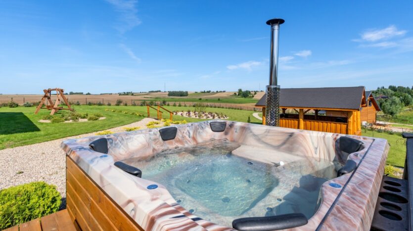 Obok domu, na drewnianym podejście, umiejscowiona jest strefa SPA wyposażona w 8-osobowe jacuzzi z hydromasażem opalane drewnem, saunę dla 8 osób również opalaną drewnem oraz drewnianą balię z zimną wodą.