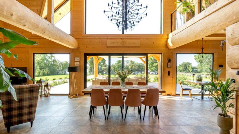 Cały front domu to wielkie przeszklenia, przez które roztacza się imponujący widok na jezioro i otaczającą zieleń. Przed domem znajduje się 50 m2 zadaszony taras z widokiem na jezioro wyposażony meble tarasowe zachęcający do niekończącego się relaksu i wypoczynku.