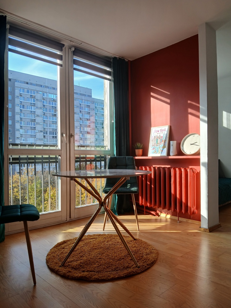 Sypialnia z lozkiem, duza szafa, osobna od pokoju dzienego z kanapa i francuskim oknem z panarama nad Warszawa. Lazienka z nowym prysznicem i nowa pralka. Kuchnia z lodowka i piekarnikem odzielna od pokojow.