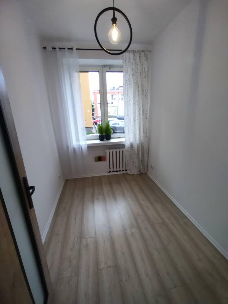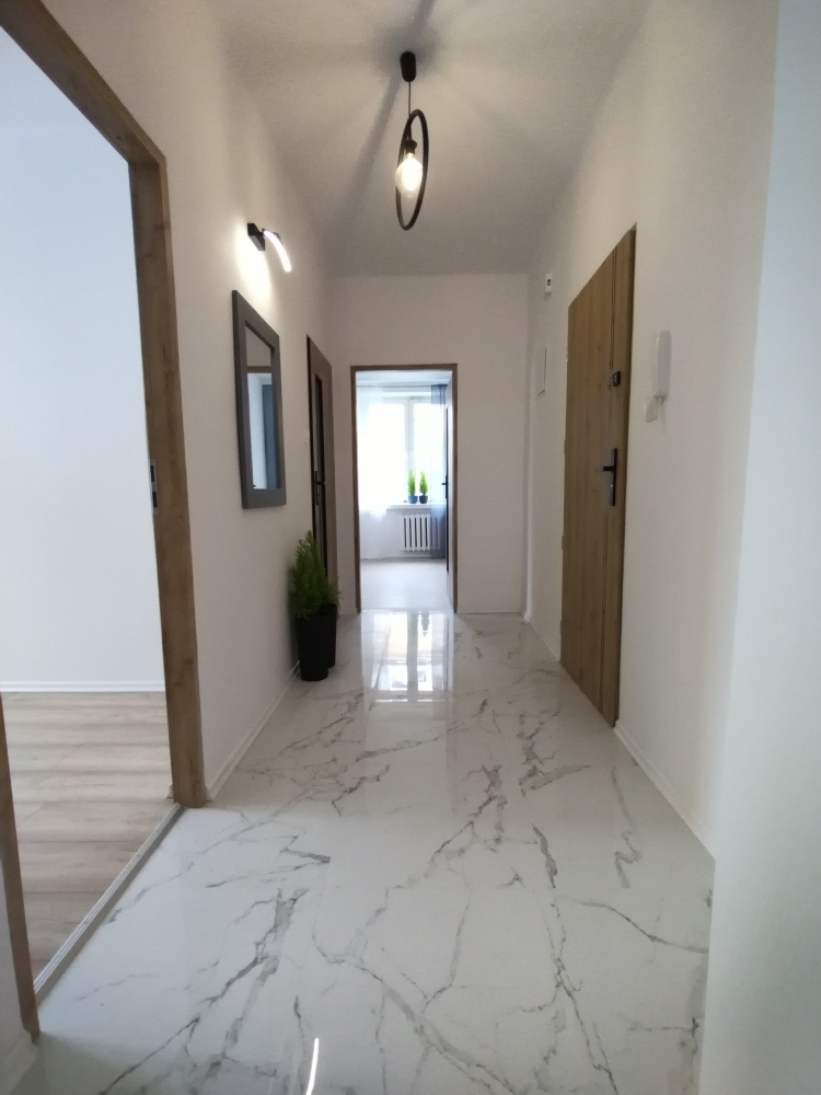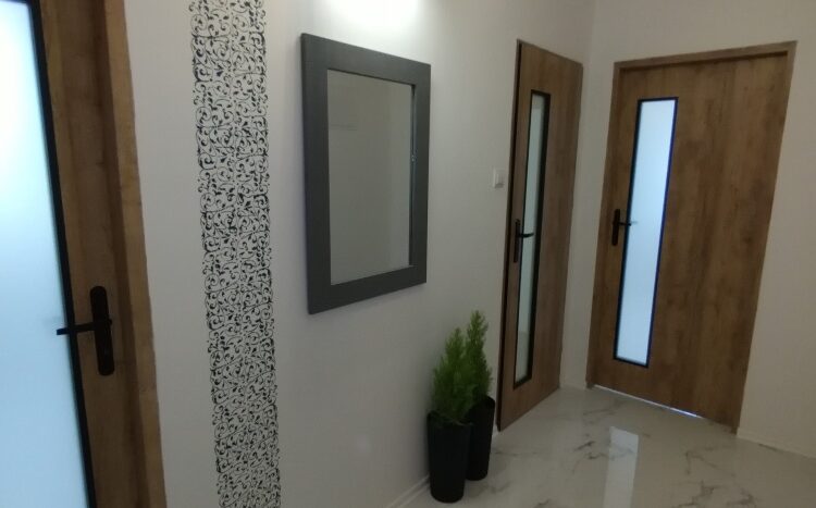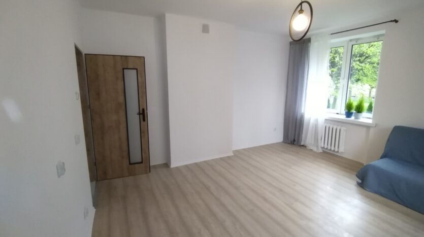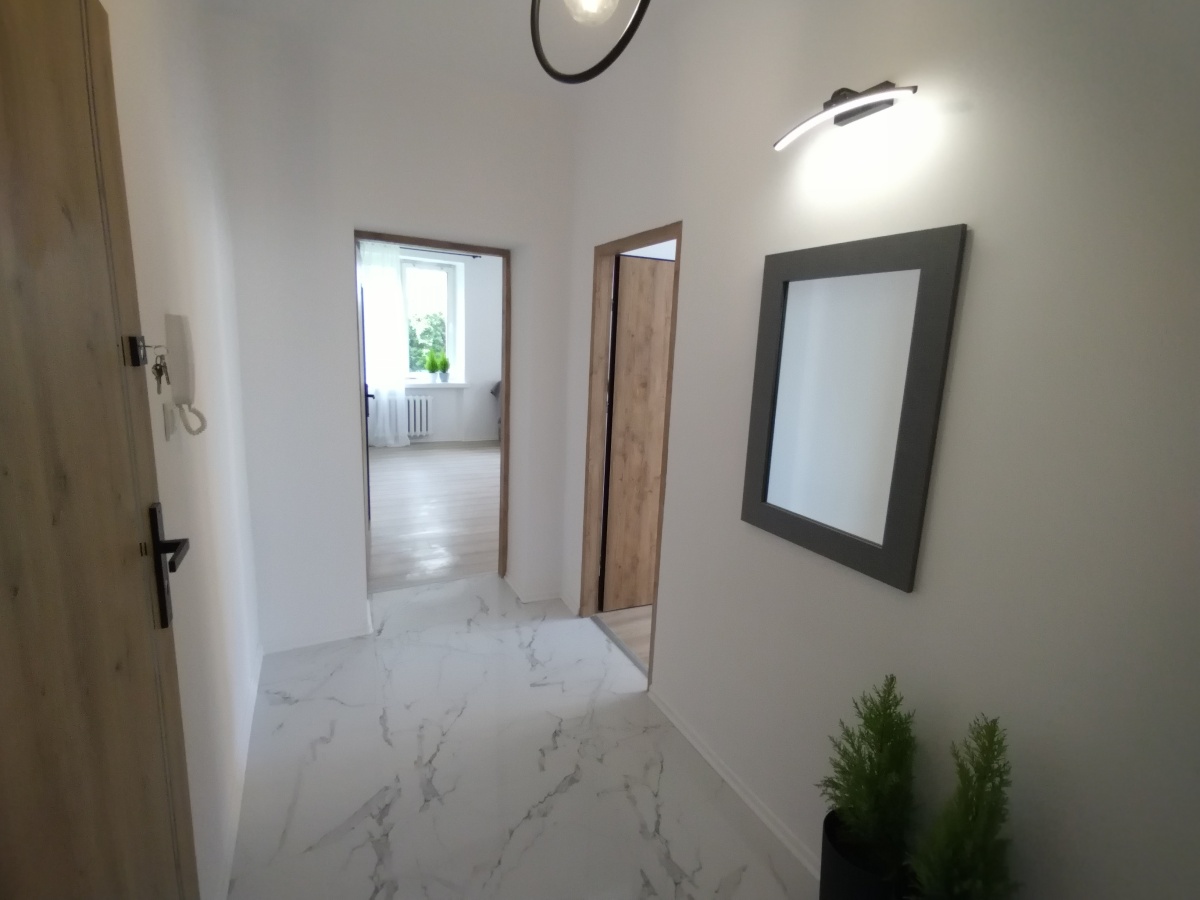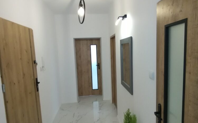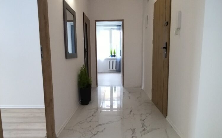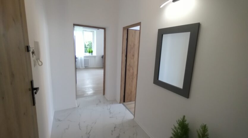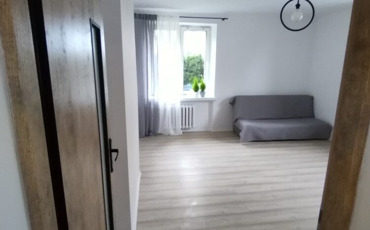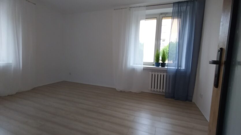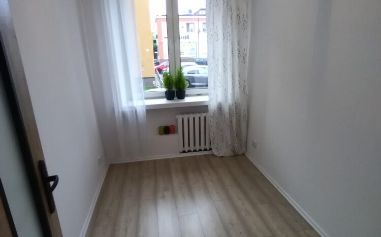 Wyremontowane, gotowe do wprowadzenia mieszkanie na parterze – 3 pokoje, kuchnia w aneksie, przedpokój, łazienka oraz piwnica. Mieszkanie dwustronne z oknami na wschód i zachód. Okna plastikowe, na podłogach panele i gres, na ścianach gładzie gipsowe. Nowe drzwi wejściowe i pokojowe. Pokoje duże w regularnych kształtach. Wymieniona instalacja wody, prądu i kanalizacji. Łazienka kompletna z kabiną prysznicową, umywalką i wc, dodatkowo przygotowana instalacja pod pralkę i suszarkę. Aneks kuchenny z przewodami elektr. pod kuchnię indukcyjną i kanałem wentylacyjnym. Centralne ogrzewanie, ciepła i zimna woda – z sieci miejskiej. Brak podzielników ciepła. Bardzo duża przynależna piwnica. Blokiem zarządza wspólnota mieszkaniowa. Blok 2-piętrowy, zbudowany z pełnej cegły, dodatkowo ocieplony, położony w osiedlowym zadrzewieniu. Bardzo małe straty cieplne. Przed blokiem duży parking. Klatki schodowe czyste, wejścia do klatek zabezpieczone domofonem. Budynek stoi z dala od ruchliwych i głośnych ulic – jest cicho i komfortowo. Blisko do stacji PKP, szkoły i przedszkola, dużo punktów handlowych i usługowych.