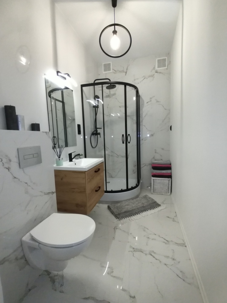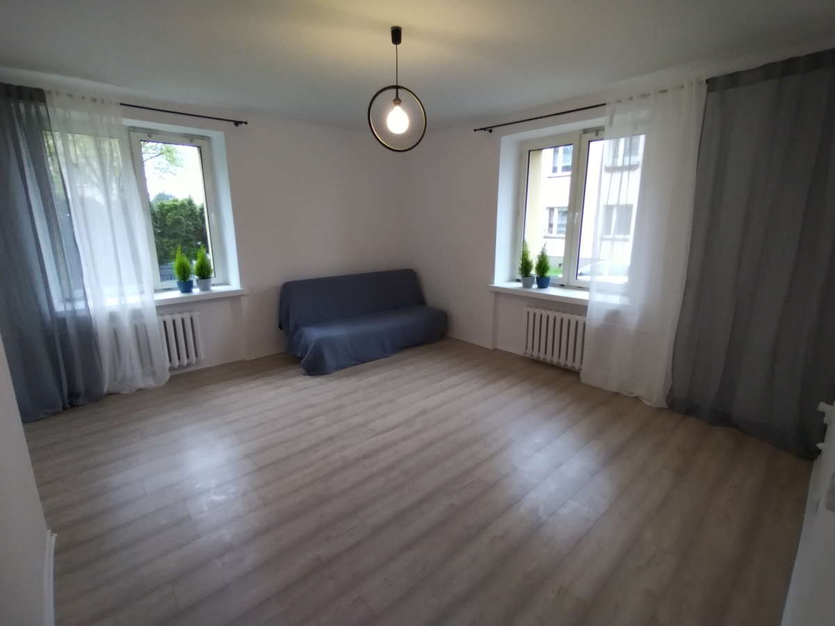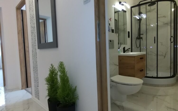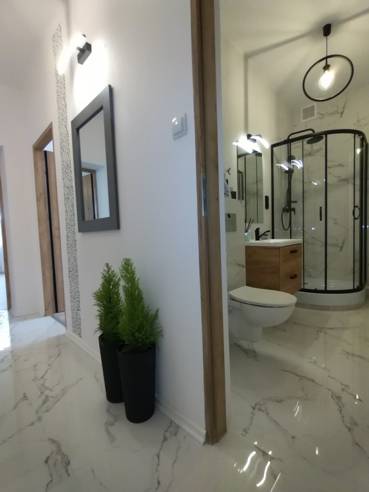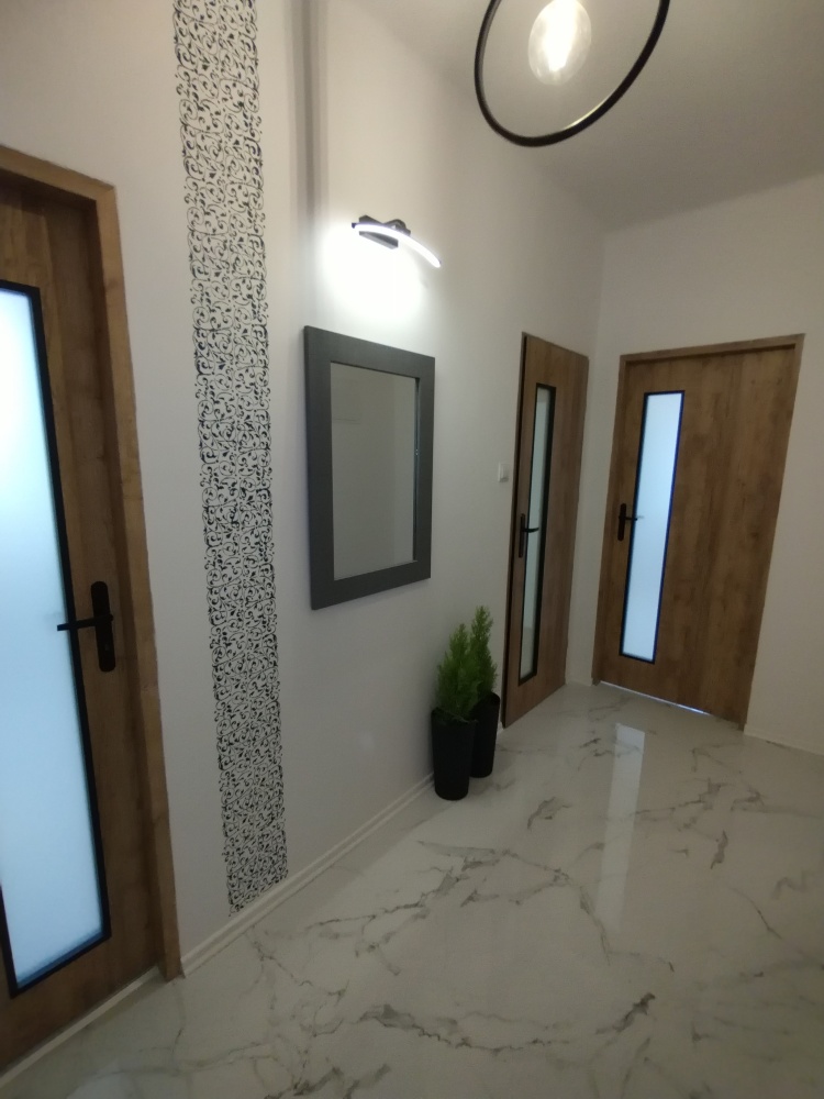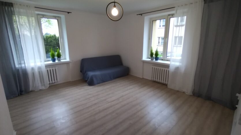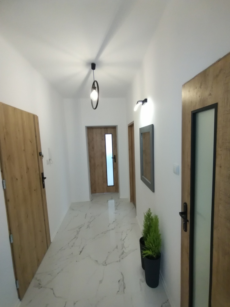 Wyremontowane, gotowe do wprowadzenia mieszkanie na parterze – 3 pokoje, kuchnia w aneksie, przedpokój, łazienka oraz piwnica. Mieszkanie dwustronne z oknami na wschód i zachód. Okna plastikowe, na podłogach panele i gres, na ścianach gładzie gipsowe. Nowe drzwi wejściowe i pokojowe. Pokoje duże w regularnych kształtach. Wymieniona instalacja wody, prądu i kanalizacji. Łazienka kompletna z kabiną prysznicową, umywalką i wc, dodatkowo przygotowana instalacja pod pralkę i suszarkę. Aneks kuchenny z przewodami elektr. pod kuchnię indukcyjną i kanałem wentylacyjnym. Centralne ogrzewanie, ciepła i zimna woda – z sieci miejskiej. Brak podzielników ciepła. Bardzo duża przynależna piwnica. Blokiem zarządza wspólnota mieszkaniowa. Blok 2-piętrowy, zbudowany z pełnej cegły, dodatkowo ocieplony, położony w osiedlowym zadrzewieniu. Bardzo małe straty cieplne. Przed blokiem duży parking. Klatki schodowe czyste, wejścia do klatek zabezpieczone domofonem. Budynek stoi z dala od ruchliwych i głośnych ulic – jest cicho i komfortowo. Blisko do stacji PKP, szkoły i przedszkola, dużo punktów handlowych i usługowych.