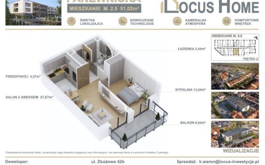 Cena w ogłoszeniu dotyczy mieszkania dwupokojowego na drugim piętrze budynku: M 2.5 – 51,02 m² – 556.118,00 zł ZAPRASZAMY na stronę: https://locus-inwesty ...